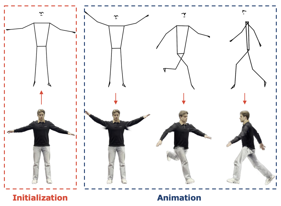 An independent research pipeline in Python for skeleton-driven animation of static 3D Gaussian Splat avatars. Combines MediaPipe pose estimation, 3D geometry alignment, Gaussian-to-bone assignment, forward kinematics, and motion transfer, leveraging PyTorch-based Gaussian Splatting representations without retraining or mesh-based rigging.