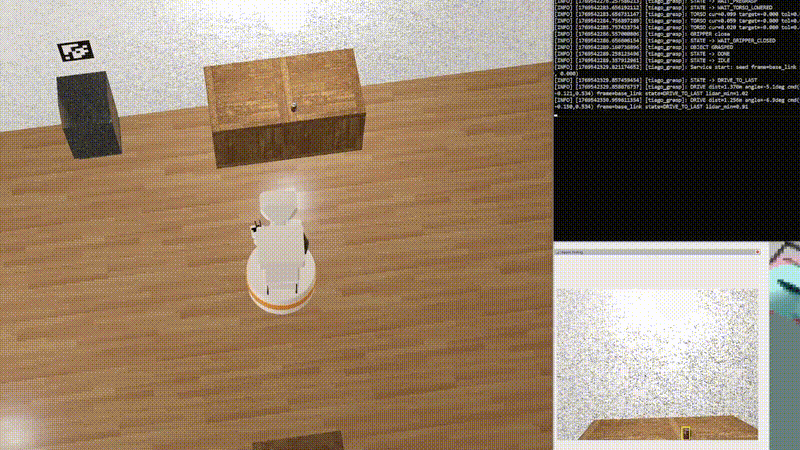 A full autonomous robot architecture built in Python on ROS 2, running on Linux with the TIAGo Webots simulator. Integrates a YOLO-based perception stack, LiDAR-driven SLAM for navigation, and a decision-making layer enabling skills like explore, table-clearing, fetch, and goal-directed navigation.